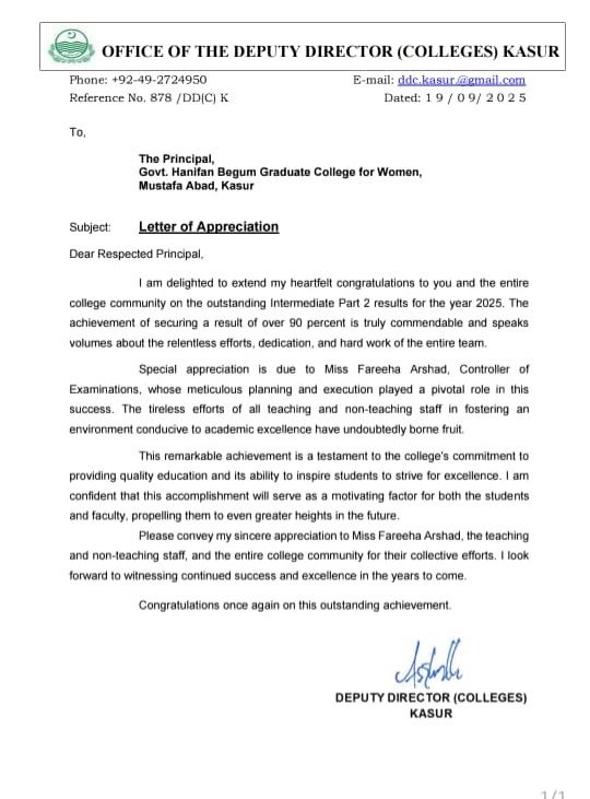 We extend our sincere gratitude to our esteemed Deputy Director Colleges, Professor Malik Asghar Ali Khan, and the Academic Wing for their appreciation.