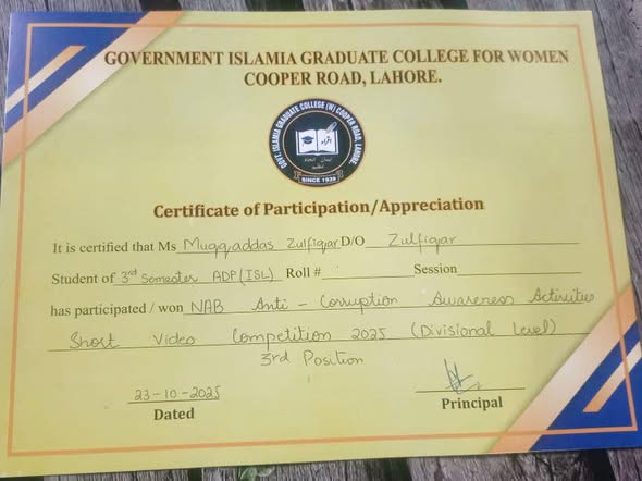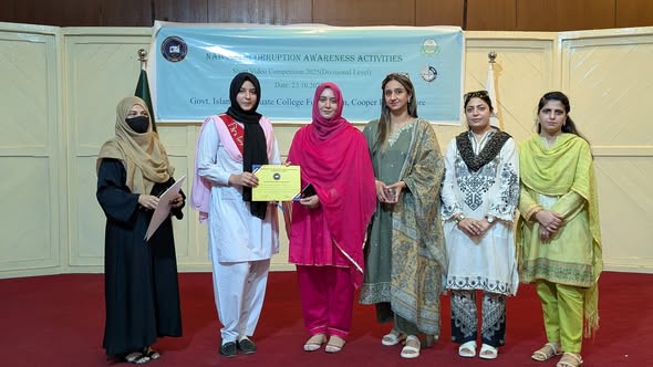 NAB ANTI-CORRUPTION SHORT VIDEO COMPETITION 2025 (DIVISION LEVEL) was held at Govt. Islamia Graduate College Cooper Road Lahore on October 23, 2025 at Shuja Ud Din Hall. The event was organized by Dept of Media Studies under the supervision of Worthy Principal Prof. Dr. Fauzia Naz, Vice Principal Madam Sabeen Ihtesham, and Head of Media Studies Dept Dr. Shazia Saeed.
